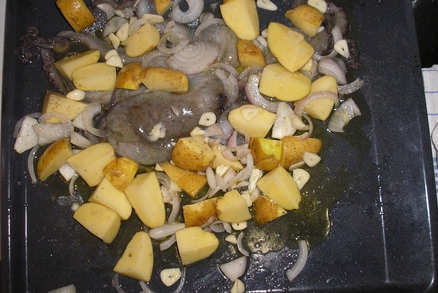 Čerstvo chobotnicu dáme na 12 hodín do mrazničky aby zmäkla. Rozmrazenú chobotnicu dáme na plech, pridáme zemiaky na kocky, pokvapkáme olivovým olejom, pridáme nasekanú cibuľu a cesnak. Osolíme. Podlejeme bielym vínom.